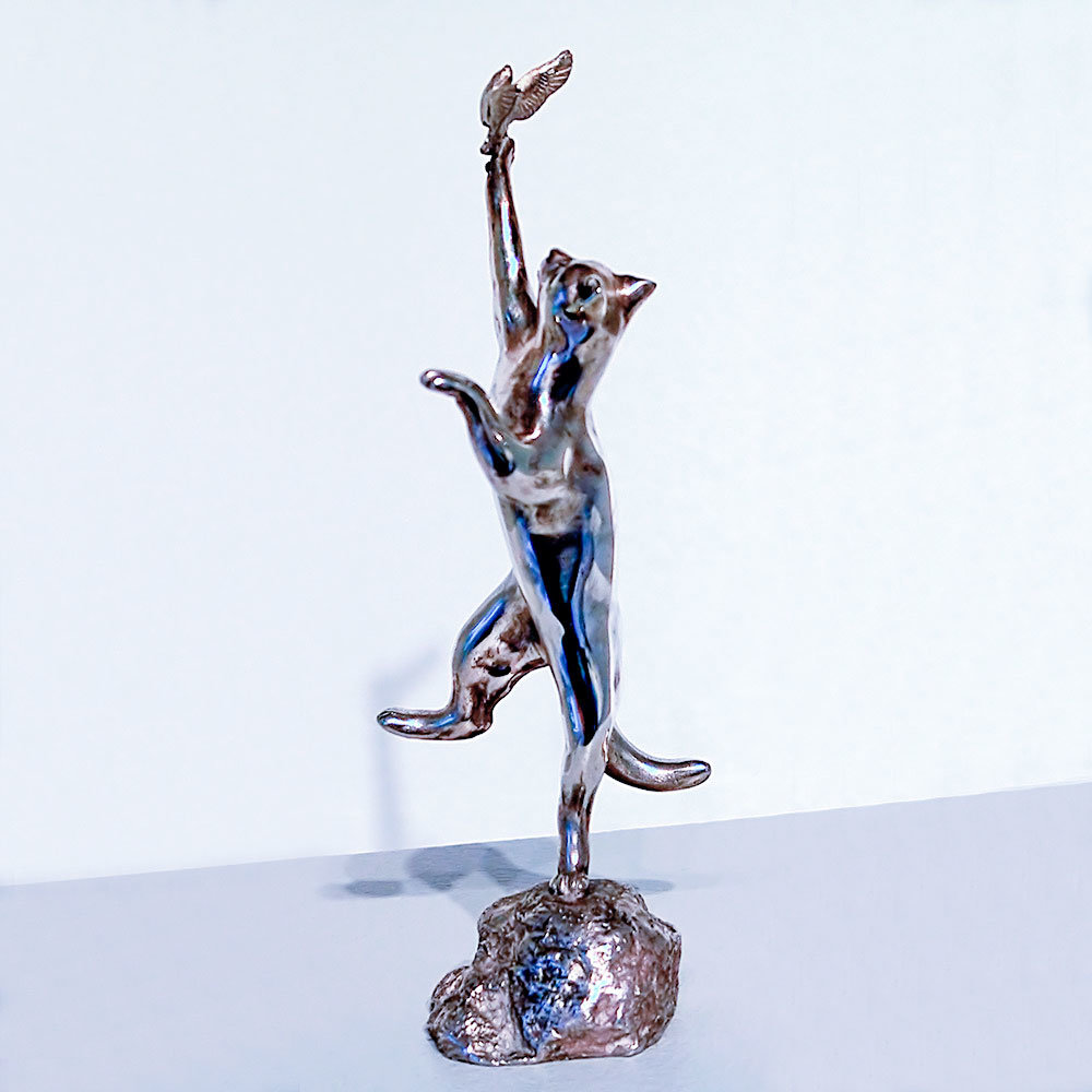 A small, hallmarked sterling silver sculpture, capturing a moment in time, as the sleek cat stretches upwards with it’s paw, just too late to catch the escaping little bird!